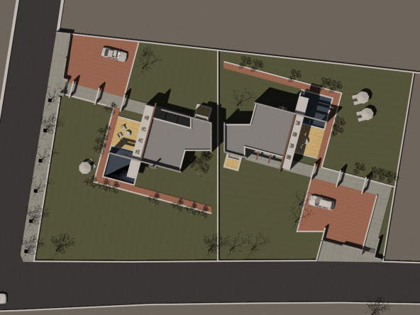 δυτική πλευρά του νησιού.Είναι μια περιοχή με αρκετό πράσινο όπου αναπτύσσονται κυρίως πολυτελείς μονοκατοικίες.Σε αυτήν την περιοχή μας ανατέθηκε να σχεδιάσουμε 2 όμοιες διώροφες μονοκατοικίες των 150,00 τ.μ. έκαστη .Στο ισόγειο των κατοικιών αναπτύσσονται οι χώροι διημέρευσης(κουζίνα, καθιστικό,W.C.) ενώ στον όροφο οι χώροι διανυκτέρευσης(3 υπνοδωμάτια, 2 λουτρά).Βασικός στόχος της σύνθεσης ήταν να δημιουργήσουμε 2 ανεξάρτητες κατοικίες (με γυρισμένες τις πλάτες τους) σε γραμμική ανάπτυξη παράλληλη με τον άξονα του διερχόμενου δρόμου στρέφοντας μόνο επιμέρους τμήματα τους για καλύτερο προσανατολισμό.Η επιμήκης γραμμική ανάπτυξη ενδυναμώνετε με την συνέχιση δομικών στοιχείων Π και πέρα από την κατοικία τονίζοντας την βασική πορεία εντός του οικοπέδου.Στόχος αυτής τις ανάπτυξης είναι η δημιουργία μεγάλου μετώπου προς το δρόμο και καλύτερη αξιοποίηση των κατά μήκος υπαίθριων χώρων .Πάνω και κάθετα σ’ αυτόν τον νοητό άξονα ξεπροβάλουν αφενός μεγάλοι εξώστες (2,50 μ.) σαν να θέλουν να προεκταθούν ακόμα περισσότερο και να εισχωρήσουν στις πράσινες πλαγιές των αντικριστών οικοπέδων και αφετέρου μικρές αρχιτεκτονικές προεξοχές σαν ξεφλουδίσματα από τον κορμό του κτιρίου δίνοντας με τις φωτοσκιάσεις τους μια πλαστικότητα και κίνηση στο μεγάλο αυτό μέτωπο.Τα πλήρη με τα κενά κατά μήκος αυτού του άξονα υποβοηθούνται με τις προεκτάσεις των χωροκανάβων από μπετόν αφήνοντας το φόντο να διαπερνά να εμπλέκεται και να συμμετέχει στην αρχιτεκτονική σύνθεση. Ο ίδιος κάναβος οργάνωσε το σύνολο και ταυτόχρονα έδωσε κλίμακα και ρυθμό στο συγκρότημα.Η ογκοπλασία, σε συνδυασμό με το χρώμα την επιλογή υλικών και την διαχείριση των υπαίθριων χώρων , αύξησαν την αναγνωρισιμότητα και διευκόλυναν την οικειότητα των χρηστών προς το χώρο. Η χαμηλή και λιτή περίφραξη σε συνδυασμό με τις διάτρητες πύλες εισόδων στο οικόπεδο αφήνουν της κατοικίες να ξεπροβάλουν μέσα από μία αυστηρά καθορισμένη βάση που ορίζει η πορεία